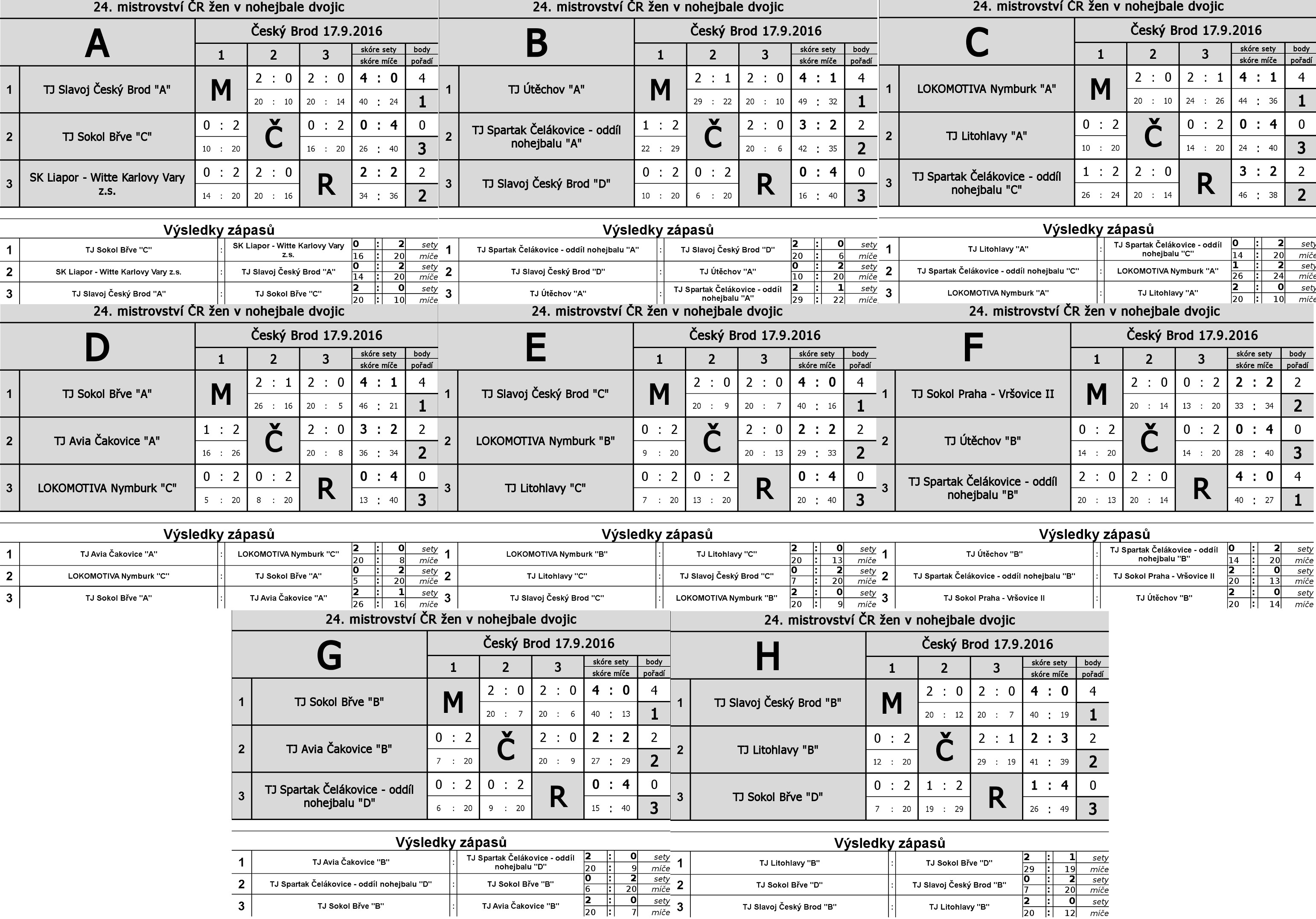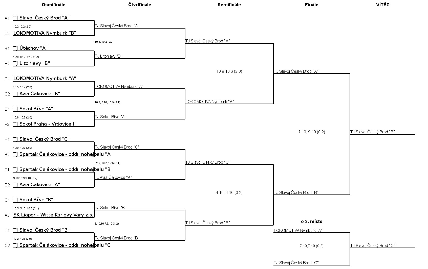 24 sestav se rozdělilo do osmi skupin po třech. První dva z každé skupiny do šestnáctičlenného play-off. Českobrodské sestavy suverénně postupovaly pavoukem a zdramatizování připustila pouze "B" sestava ve čtvrtfinále s Břvemi "B", kde rozhodoval poslední možný míč. Právě "B" sestava ve složení Cibulková, Červenková a Vokáčová se nakonec probojovala na pozici nejvyšší, když ostatní stupně vítězů obsadila "A" resp. "C" sestava.